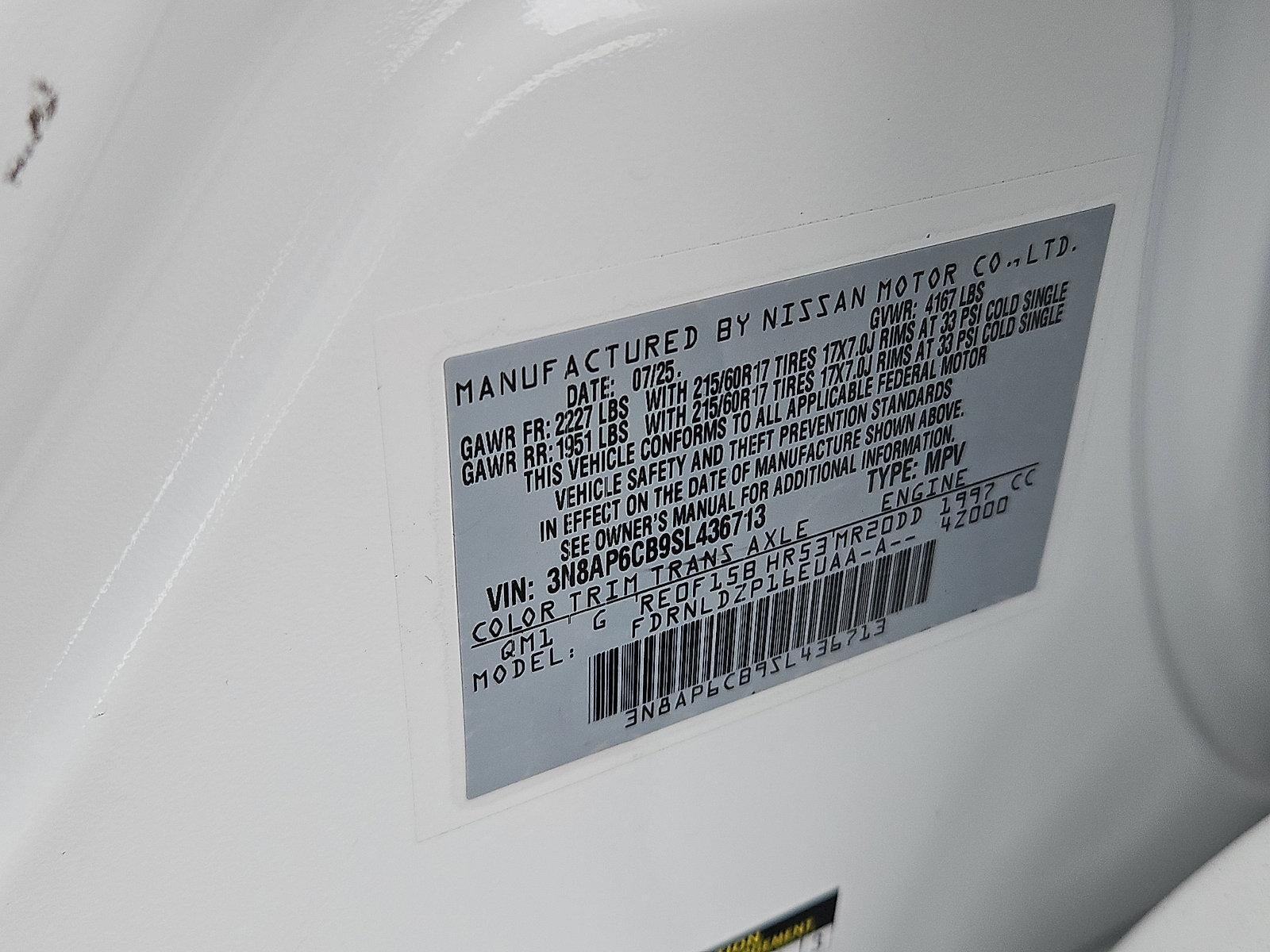 Certified. Fresh Powder 2025 Nissan Kicks SV AWD CVT with Xtronic 2.0L DOHC Heated Front Seats, Illuminated Driver & Passenger Sun Visors, Panoramic Moonroof, Remote Engine Start, Roof Rails, Seat Back Pocket, Sunglass Holder, SV Premium Package.